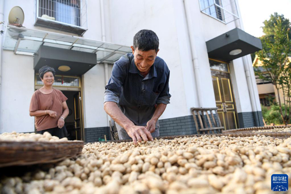 安徽省金寨县大湾村村民在自家新房前晾晒花生(2019年9月3日摄)。新华社记者 鲍菲菲 摄