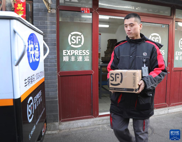 顺丰北京石头胡同营业站“快递小哥”刘阔在整理包裹(2019年2月1日摄)。新华社记者 李德欣 摄