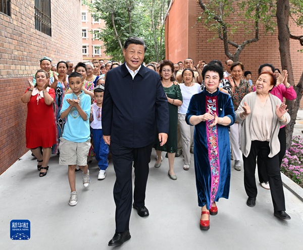 7月12日至15日,中共中央总书记、国家主席、中央军委主席习近平在新疆考察。这是13日上午,习近平在乌鲁木齐市天山区固原巷社区考察时,同各族群众亲切交流。新华社记者 谢环驰 摄