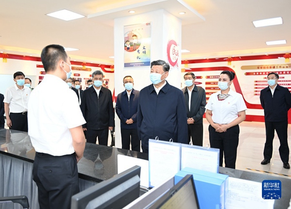 7月12日至15日,中共中央总书记、国家主席、中央军委主席习近平在新疆考察。这是13日上午,习近平在乌鲁木齐市天山区固原巷社区党群服务中心大厅,同工作人员亲切交流。新华社记者 谢环驰 摄