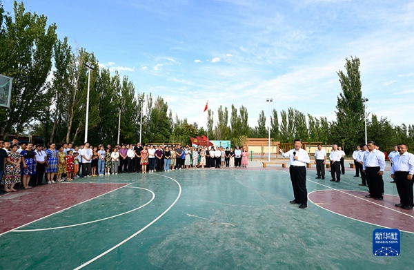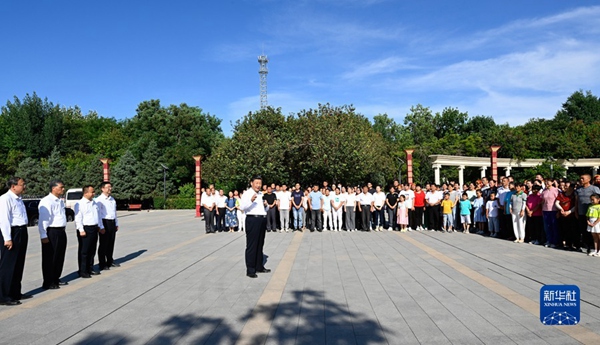 7月12日至15日,中共中央总书记、国家主席、中央军委主席习近平在新疆考察。这是13日下午,习近平在新疆生产建设兵团八师一四三团花园镇广场,同兵团干部群众亲切交谈。新华社记者 李学仁 摄