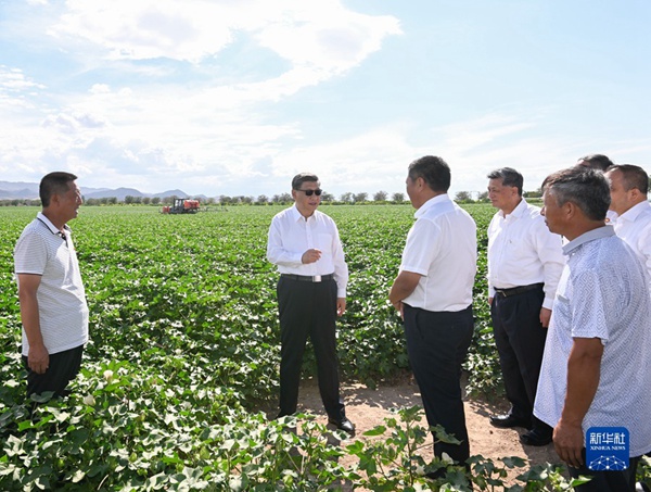 7月12日至15日,中共中央总书记、国家主席、中央军委主席习近平在新疆考察。这是13日下午,习近平在新疆生产建设兵团八师一四三团农一连棉花种植基地考察。新华社记者 申宏 摄