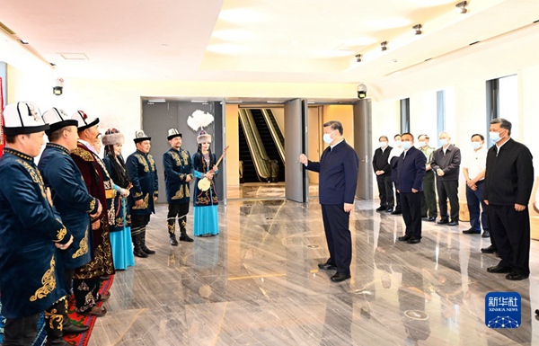 7月12日至15日,中共中央总书记、国家主席、中央军委主席习近平在新疆考察。这是13日上午,习近平在乌鲁木齐市新疆维吾尔自治区博物馆,同《玛纳斯》非物质文化遗产传承人在一起。新华社记者 谢环驰 摄