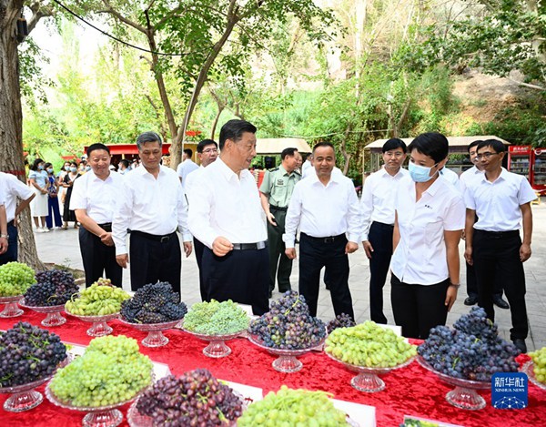 7月12日至15日,中共中央总书记、国家主席、中央军委主席习近平在新疆考察。这是14日,习近平在吐鲁番市葡萄沟察看吐鲁番特色水果展示,了解当地发展葡萄特色产业、促进文旅融合发展等情况。新华社记者 李学仁 摄