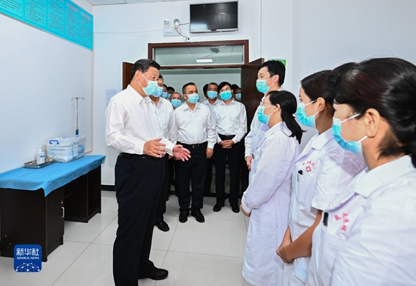 7月12日至15日,中共中央总书记、国家主席、中央军委主席习近平在新疆考察。这是14日,习近平在吐鲁番市高昌区亚尔镇新城片区新城西门村党群服务中心医务室考察。新华社记者 燕雁 摄