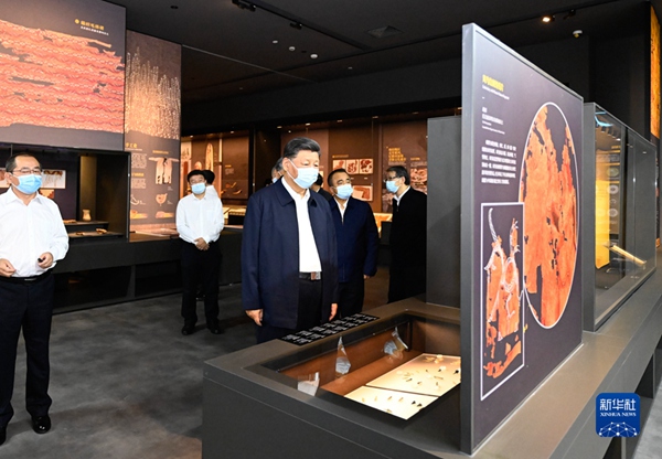 随后,习近平来到新疆维吾尔自治区博物馆,参观《新疆历史文物展》,观看民族史诗《玛纳斯》说唱展示,并同《玛纳斯》非物质文化遗产传承人亲切交谈。习近平指出,中华文明博大精深、源远流长,是由各民族优秀文化百川汇流而成。要加强中华民族共同体历史、中华民族多元一体格局的研究,充分挖掘和有效运用新疆各民族交往的历史事实、考古实物、文化遗存,讲清楚新疆自古以来就是我国不可分割的一部分和多民族聚居地区,新疆各民族是中华民族大家庭血脉相连、命运与共的重要成员。要加强非物质文化遗产保护传承,把各民族优秀传统文化发扬光大。