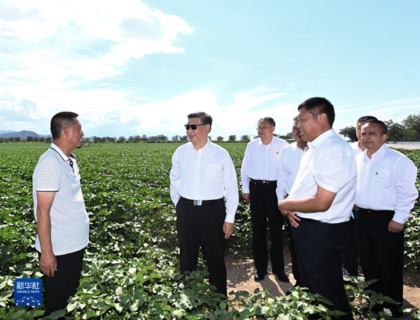 7月12日至15日,中共中央总书记、国家主席、中央军委主席习近平在新疆考察。这是13日下午,习近平在新疆生产建设兵团八师一四三团农一连棉花种植基地考察。新华社记者 谢环驰 摄