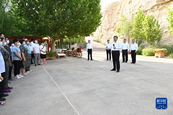 7月12日至15日,中共中央总书记、国家主席、中央军委主席习近平在新疆考察。这是14日,习近平在位于吐鲁番市的世界文化遗产交河故城考察时,同游客亲切交流。新华社记者 谢环驰 摄