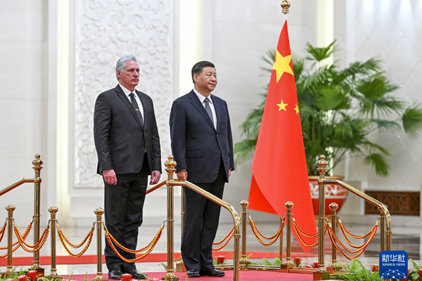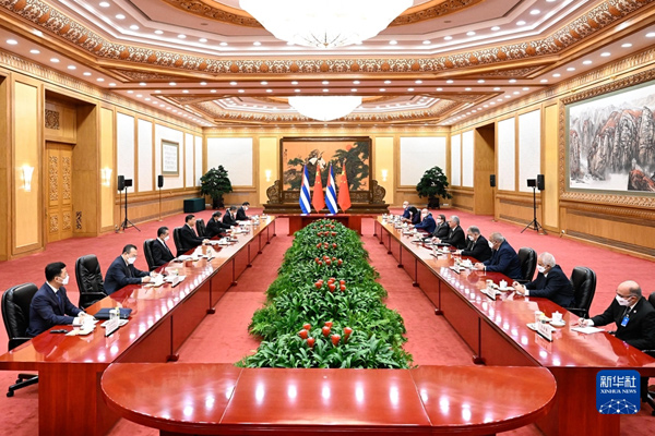 习近平指出,你是中共二十大后首位访华的拉美和加勒比国家元首,充分体现了中古两党两国的特殊友好关系。古巴是西半球第一个同新中国建立外交关系的国家,中古关系成为社会主义国家团结合作、发展中国家真诚互助的典范。中方愿同古方不断深化政治互信,拓展务实合作,在涉及彼此核心利益问题上坚定相互支持,在国际和地区事务中加强协调配合,在建设本国特色社会主义道路上携手并进,不断深化新时代中古关系。
