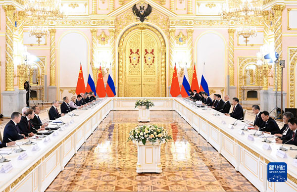 当地时间3月21日下午,国家主席习近平在莫斯科克里姆林宫同俄罗斯总统普京举行会谈。这是两国元首举行大范围会谈。新华社记者 申宏 摄