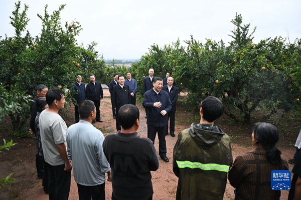 9月24日,中共中央总书记、国家主席、中央军委主席习近平在浙江考察结束返京途中,来到山东省枣庄市考察。这是习近平在位于峄城区的冠世榴园石榴种植园同老乡们亲切交流。新华社记者 燕雁 摄