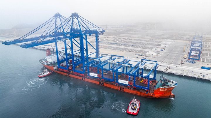 6月27日,岸边集装箱起重机和轨道吊运抵秘鲁钱凯港。新华社发(上海振华重工供图)